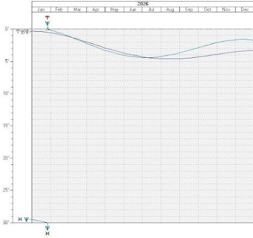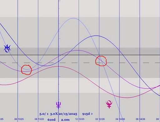 3月7日には海王星が天王星・冥王星のミッドポイントと合になるという極めて重要な天体配置となります。この合の配置は2025年8月の12:21アセンションポータル中に一度起きており、次回は2026年7月9日に最後の1回が起きます(今後約500年間は起こりません)。